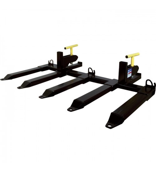These Load-Quip® Steel Debris Forks are an essential accessory for any tractor, skid steer or loader with bucket. Perfect for moving debris, hay, lumber, brush and more. Compatible with almost any bucket, making any construction, ag. or do-it-yourself job easier and faster. Forks feature fully welded construction with reinforced critical areas and 5in. x 2in. tines. Each features 5 forks and 3 chain buckles. Chain bucket loop and chain retainer is a versatile tie-down point that works with chains up to 1/2in. grade 70. E-Z Load Tip with Lifting Eye has a 45° slope for easy loading and accepts hitch balls. Clamps directly onto your existing bucket with no modifications or drilling required. Uses a non-slip knurled Gripper T-handle with a Sure Grip contact pad with ball joint for constant sturdy attachment to the bucket.